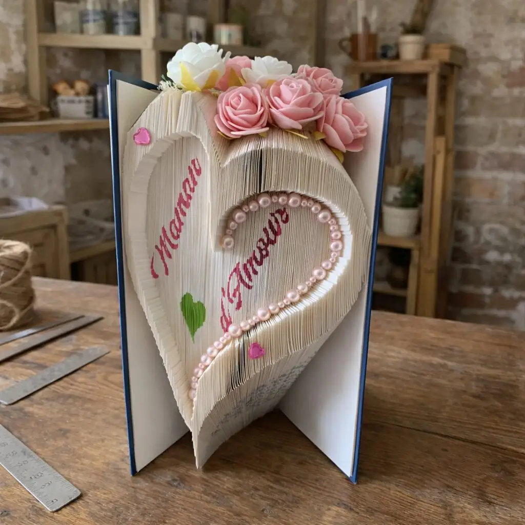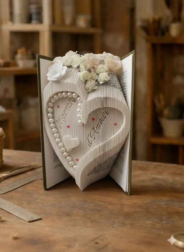 Découvrez une création artisanale exceptionnelle : un livre sculpté avec soin dont les pages pliées forment un magnifique cœur en relief. Décoré de perles roses et blanches et orné de délicates fleurs artificielles, il incarne l’élégance et la tendresse.